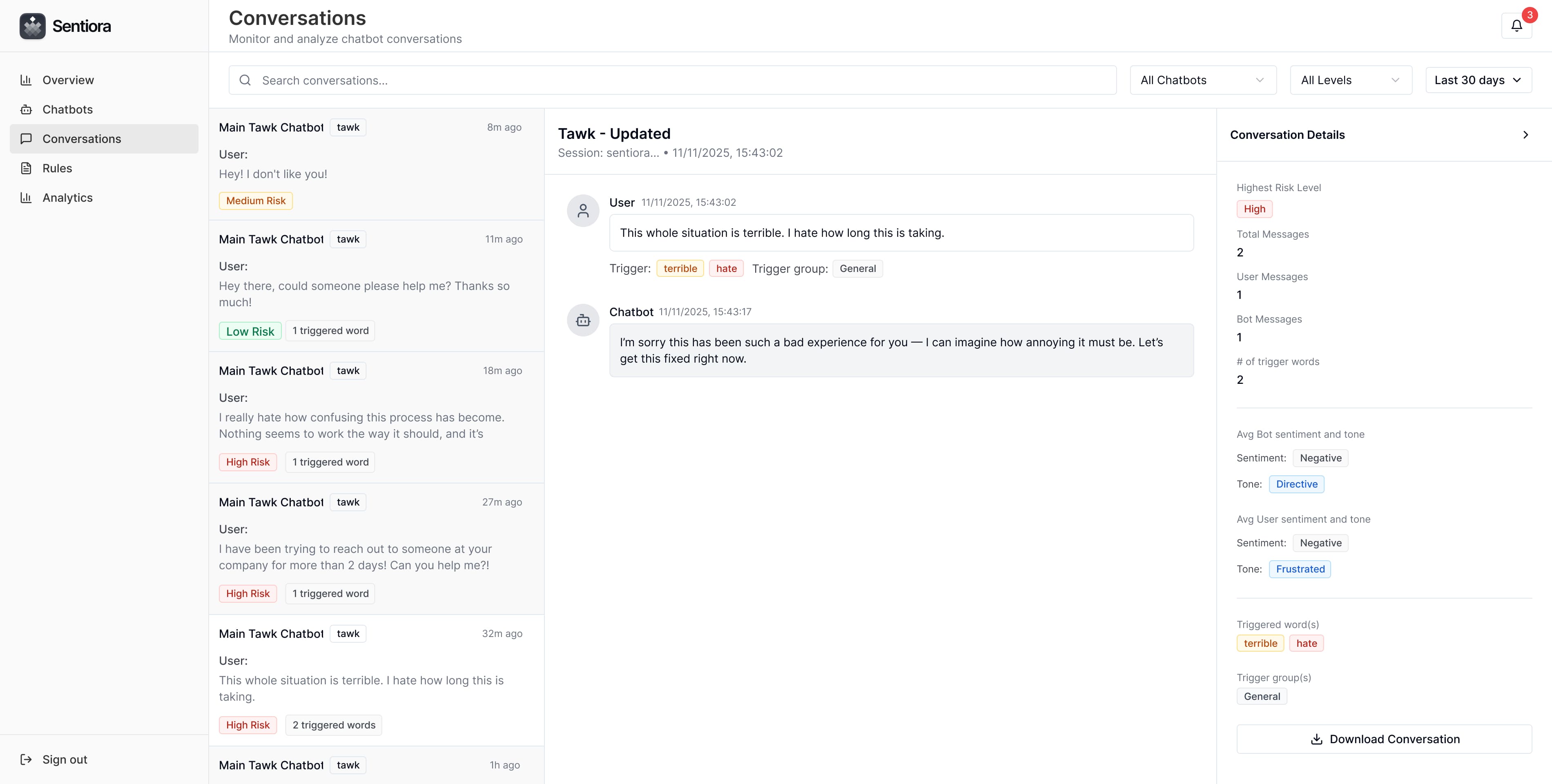 Monitor your website's chatbot interactions in real time and keep a closer eye on how they communicate. Sentiora detects messages that may be risky, misleading, or off-tone, analyzes sentiment, and tracks important keywords—all while notifying you instantly when high-severity terms or behaviors appear.