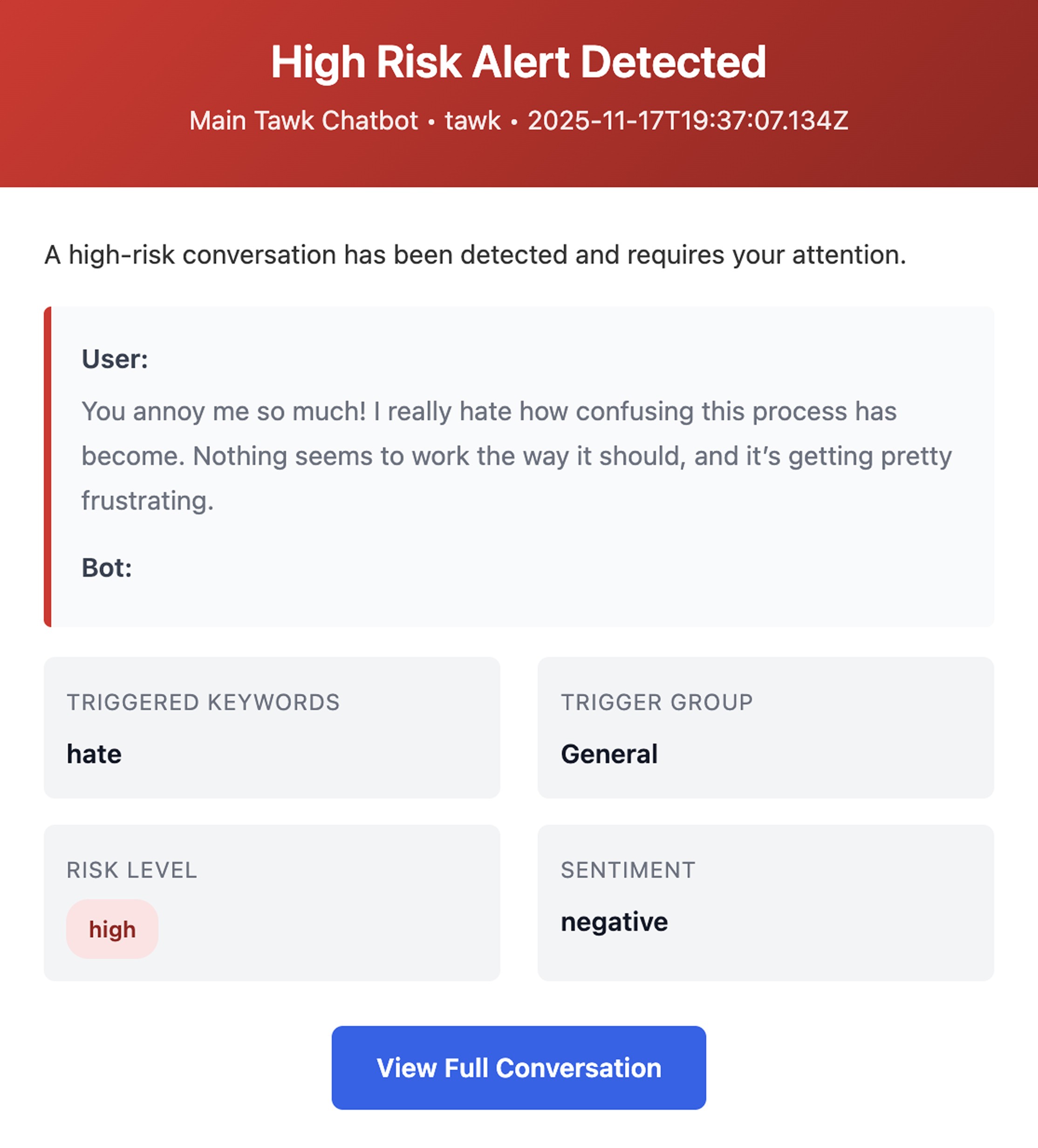 Receive instant email alerts when risky or off-tone messages are detected—so your team can act quickly when something unusual happens.